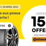 Du 16 mars au 25 avril 2026, profitez de notre offre jusqu’à 150€ offerts* pour l’achat de pneus de la marque Continental ou 120€ remboursés.